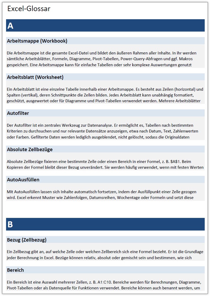 In Zeiten von Künstlicher Intelligenz (KI) ist es besonders effizient, sich auf ein kompaktes Excel-Glossar mit kurzen, prägnanten Erklärungen zu konzentrieren. Moderne KI kann ausführliche Beschreibungen flexibel und individuell zu jedem Begriff liefern.