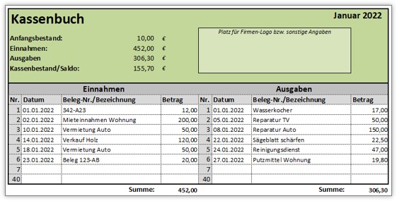 - Kopfbereich mit dem monatlichen Anfangsbestand, der Summe aus den Einnahmen, der Summe aus den Ausgaben sowie dem aktuellen Kassenstand