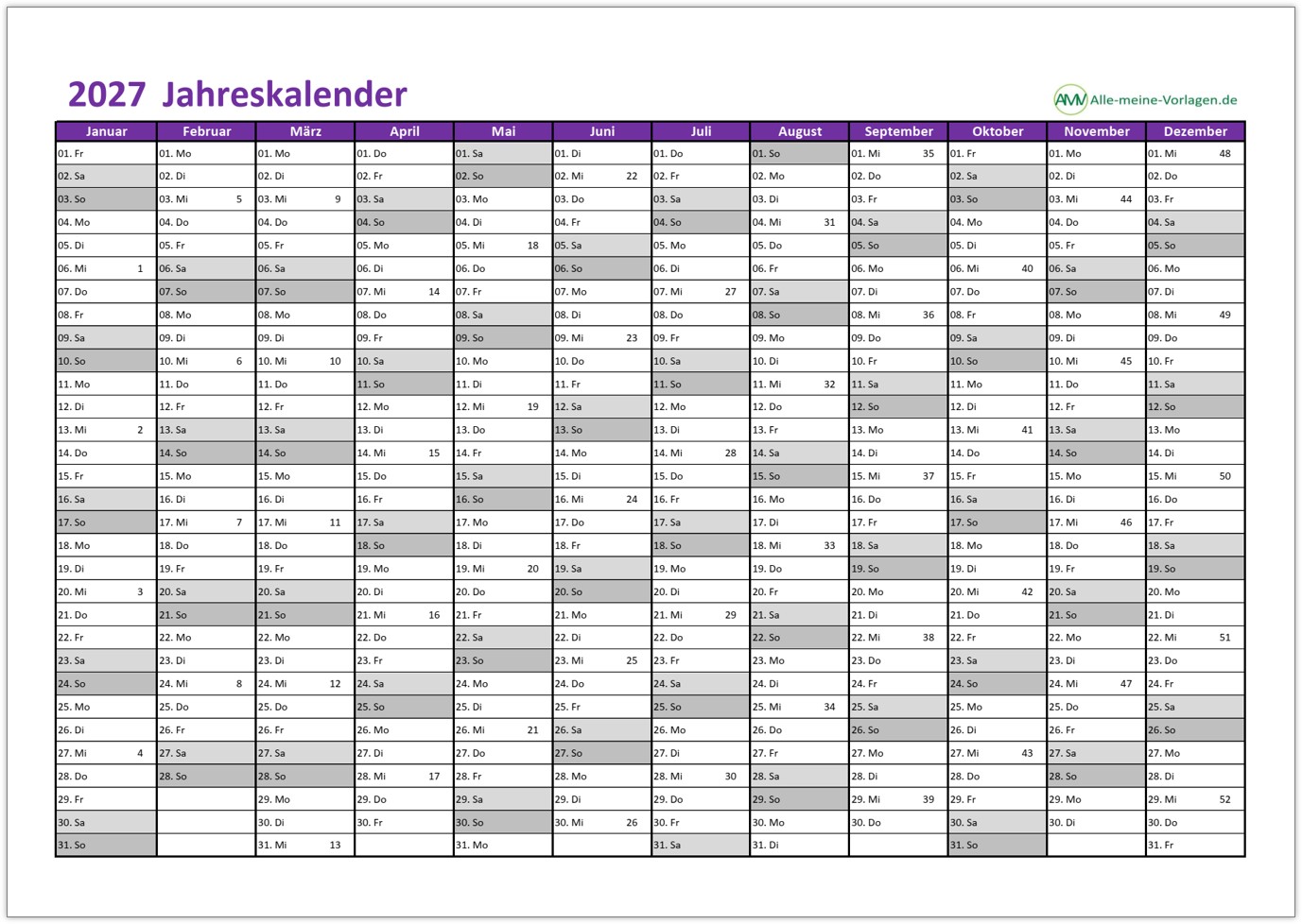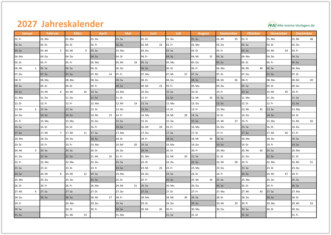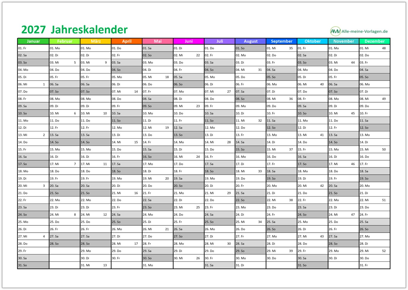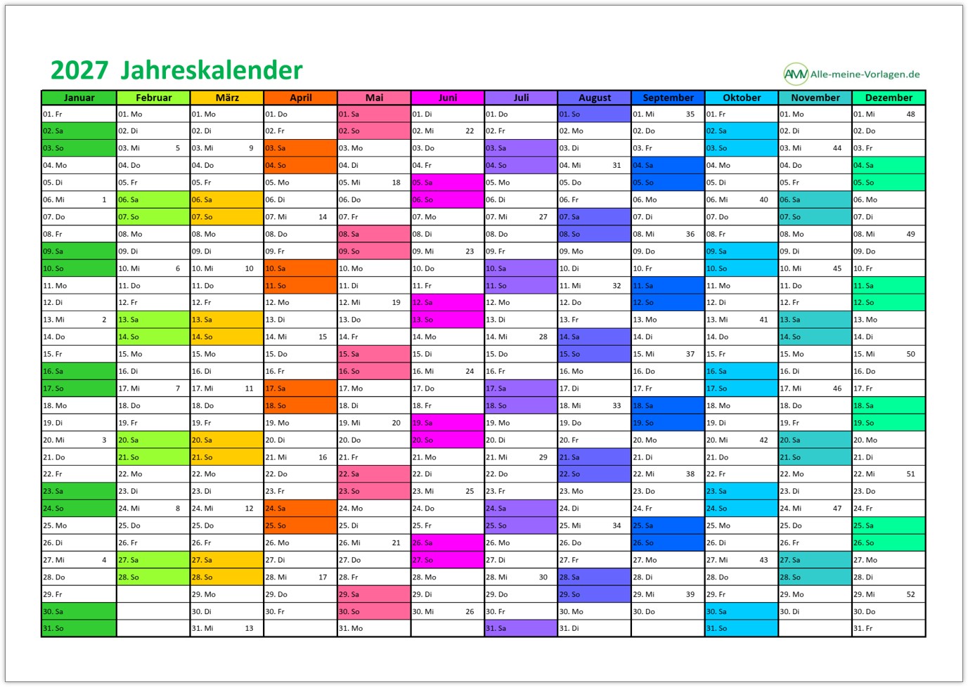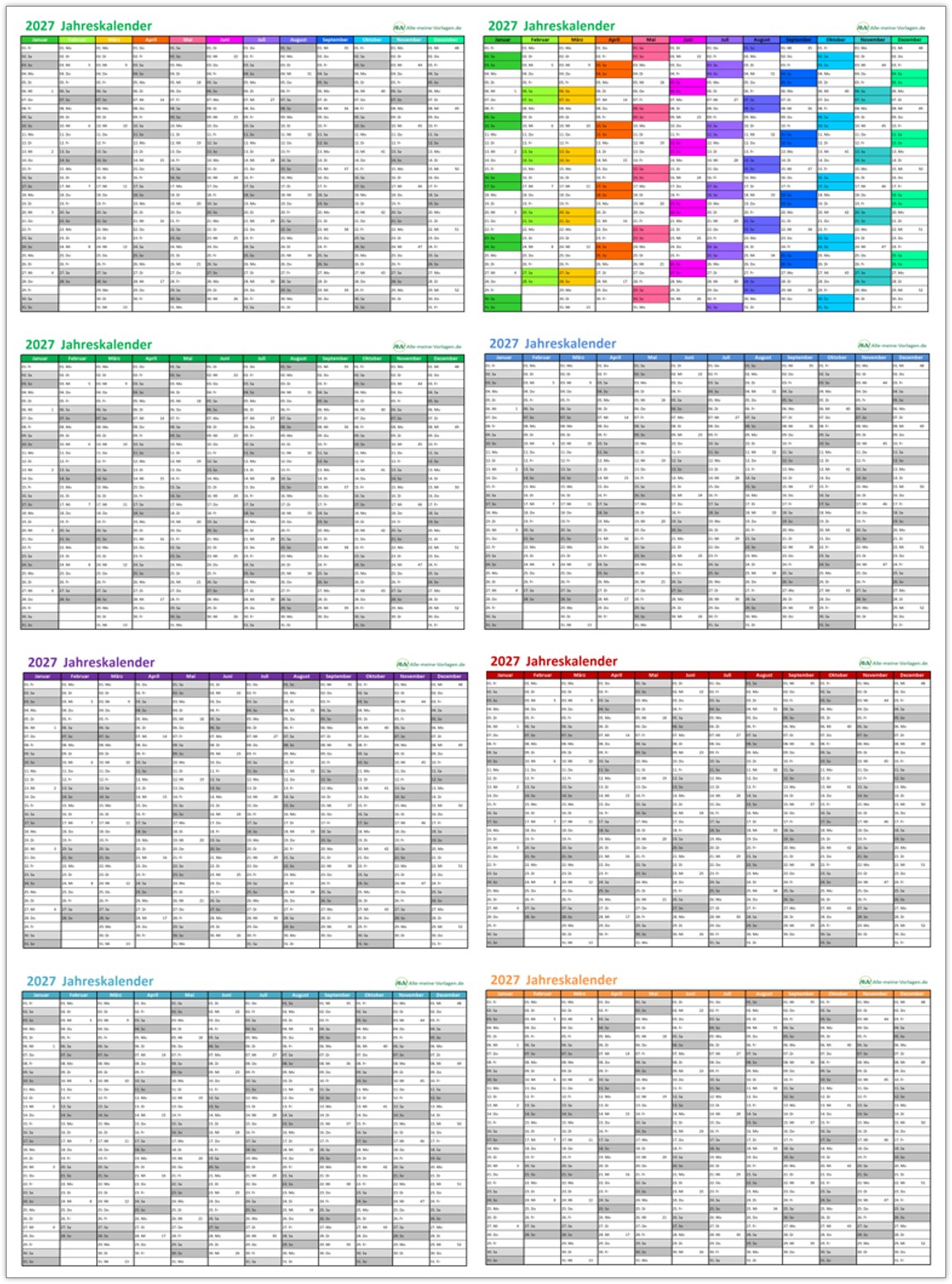 - Die Kalendervorlage für 2027 ist in 8 verschiedenen Farben zum Download verfügbar. Diese sind: Blau, Grün, Rot, Orange, Türkis, Lila und in zwei bunten Ausführungen