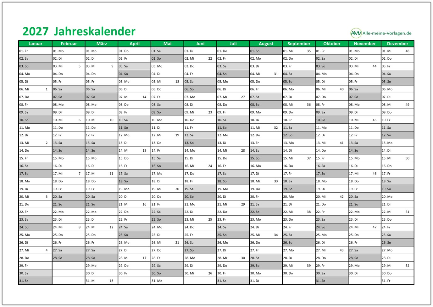 Du bist auf der Suche nach einem Jahreskalender für 2027? Perfekt, dann bist du hier genau richtig! Auf alle-meine-vorlagen.de findest du eine riesige Auswahl an Kalendervorlagen, die dich bei deiner Jahresplanung 2027 unterstützen. Und das Beste daran? Alle Vorlagen beruhen auf Excel. Du kannst sie daher ganz einfach an deinen Bedarf anpassen oder vielleicht sogar miteinander mischen und so die für dich perfekt Vorlage erstellen. Die folgenden Vorlagen haben wir für dich: