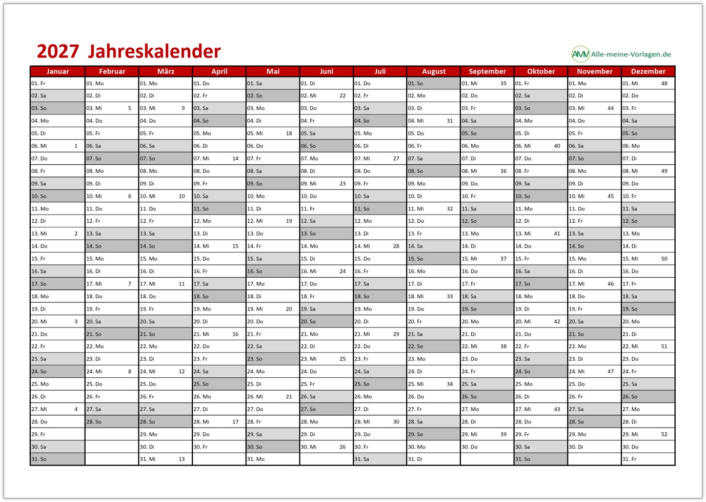 Die Vorlage Kalender 2027 zeigt dir alle 12 Monate des gesamten Jahres übersichtlich auf einer Seite an. Pro Woche wird die Kalenderwoche angezeigt. Für jeden Monat ist jeder Tag aufgelistet. Samstage und Sonntage sind in Grautönen hervorgehoben.
