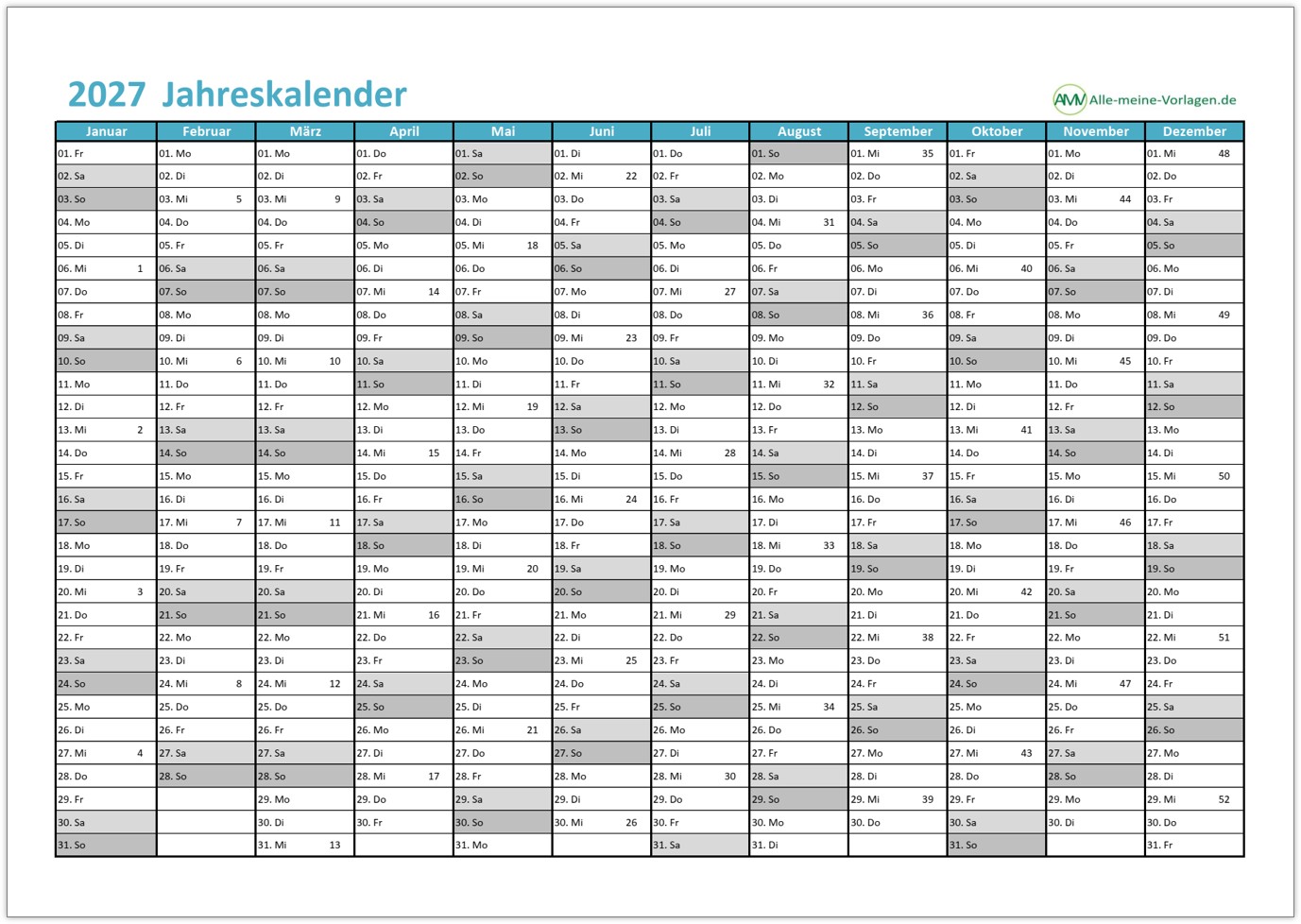 Den Kalender 2027 gibt es hier als Excel Vorlage und auch als PDF-Kalender 2027 zum kostenlosen Download in verschiedenen Farben.