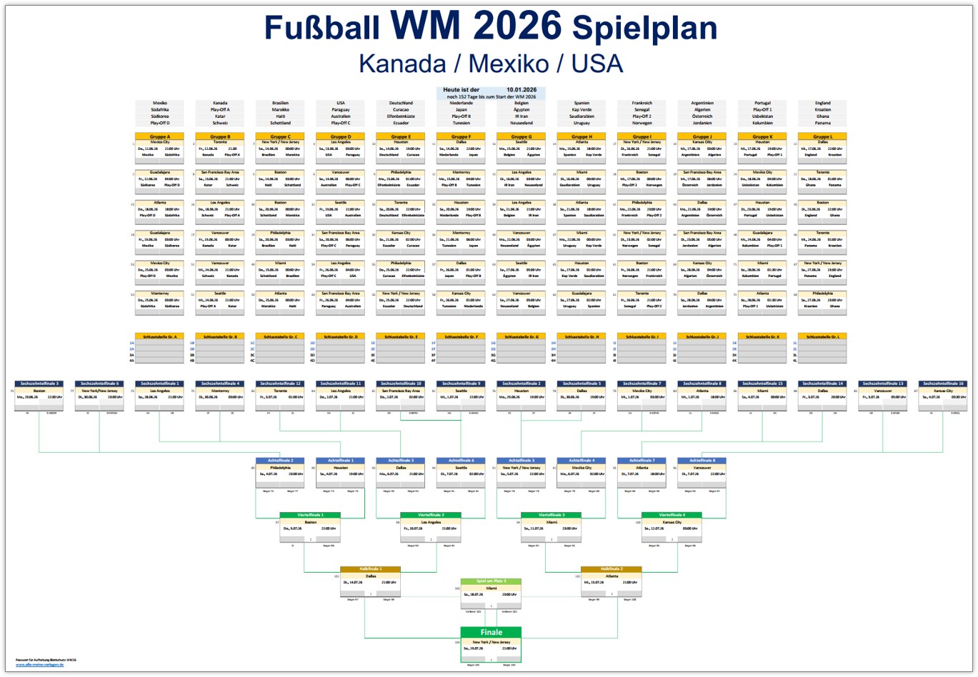 Im Folgenden wird die Struktur der WM 2026 Spielplan-Vorlage für Excel erläutert. Für die WM 2026 ist der Spielplan verbindlich festgelegt. Der Verlauf einer Mannschaft bis zum Finale steht somit fest. Voraussetzung hierfür ist das Bestehen der Gruppenphase sowie der Sieg in jeder weiteren Begegnung ab dem Sechzehntelfinale.